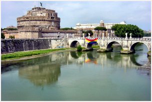 Tout d'abord mausolée d'Hadrien, cette massive construction circulaire fut convertie en forteresse pontificale au VIe siècle. C'est le pape Grégoire le Grand qui, en 590, lui donna son nom actuel après avoir vu un ange apparaître au-dessus du bâtiment, annonçant la fin de l'épidémie de peste à Rome. En 136, Hadrien fit bâtir le pont Saint-Ange qui enjambe le Tibre afin de fournir un accès à sa dernière demeure. On le reconstruisit en 1450, en réutilisant certaines parties d'origine. De part et d'autre du tablier, des anges sculptés au XVIIe siècle par le Bernin et ses élèves portent les instruments de la Passion.