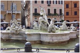 Bordées de palais baroques, la place Navone recouvre le site du stade de Domitien construit en 86 de notre ère. Elle comporte trois superbes fontaines, dont, en son centre, la fontaine des Fleuves du Bernin (1651). Quatre imposantes statues incarnent le Gange, le Nil, le Danube et le Rio de la Plata et un obélisque égyptien surmonte l'ensemble. Toujours débordante d'animation, la place Navone est le lieu de rassemblement des Romains comme des touristes qui se bousculent aux terrasses des cafés et des glaciers.