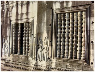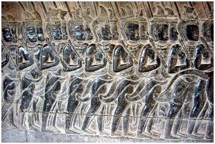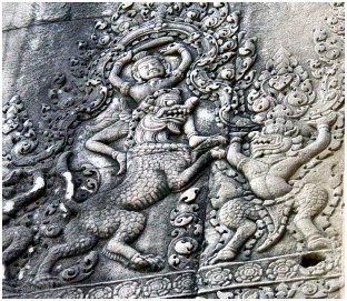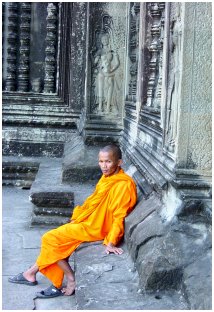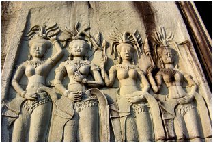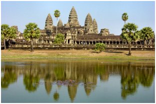Angkor Wat est le temple le plus grand, le plus connu et le plus majestueux des temples du site d'Angkor. Ses cinq tours sont célèbres dans le monde entier, notamment grâce au cinéma : elles servirent de décor à Lord Jim et à Apocalypse Now. Ces tours sont l'emblème du pays et figurent sur le drapeau national. Sa construction fut commencée au début du XIIème siècle pendant le règne du roi Sûryavarman II et a duré 37 ans. Son nom signifie en Khmer " la Pagode de la ville". Ce temple-montagne est entièrement dédié à Vishnou, dieu suprême de l'hindouisme, symbolisé par la tour centrale (le phallus est un attribut divin). D'ailleurs, tout est symbolique à Angkor Wat : les murs d'enceinte (1025 m sur 800 m) représentent la chaîne de montagnes sur laquelle repose le mont Meru, centre de l'univers pour les hindouistes.