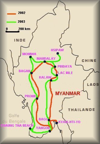 Chaung Tha Beach et Yangon. Voyage effectué en fév./mars 2003 (19 jours) plus un arrêt de 4 jours sur Bangkok (A/R). **La location de voiture avec chauffeur s'avère être la meilleure solution pour visiter le pays (gain de temps et autonomie complète). Notre chauffeur (pour les 2 voyages) parlait anglais et servait également de guide. Merci à Kyaw Khaing pour ces deux beaux voyages. **Moments forts : La visite du Golden Rock à Kyaik-Hti-Yo, le trekking à Kalaw, Myin Ma Hti et les ordinations de novices dans les tributs, la grotte aux 8094 Bouddas à Pindaya, le Lac Inle, le monastère de Mahagandhayon et les ordinations de moines à Mandalay, le pont d'U Bein à Amarapura, les 2000 temples de Bagan, la balade sur la rivière à Hsipaw, les grottes de Po Win Daung à Moniwa, les balades sur l'Irrawady, les plages de Chaung Tha Beach et la fête de la pleine lune dans la pagode Shwedagon à Yangon. |
