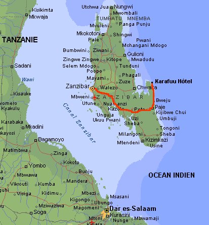 Séjour de 5 nuits sur l'île (1 nuit à Zanzibar-Town au Tembo Hôtel et 4 nuits au Karafuu hôtel) après un Safari de 10 jours en Tanzanie effectué en sept. 1998, plus une semaine de repos à Diani beach à l'hôtel Papillon Lagoon Reef à 40km de Mombasa (Kenya). *Pour venir sur l'île: En avion d'Arusha en Tanzanie. *Destination idéale après un safari en Tanzanie ou au Kenya. Vols directs sur Zanzibar. **Moments forts : la visite de la vieille ville de Zanzibar-Town, la route des épices et le lagon du Karafuu hôtel. |