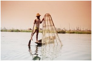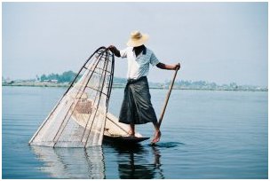Autres originalités des Inthas : les méthodes de pêche et la façon de ramer. Avec une si faible profondeur (plus souvent 1 m que 5), les poissons se révèlent parfaitement visibles. Les Inthas ont imaginé une sorte de nasse en forme de cône qu'ils plaquent à l'endroit où ils ont repéré du poisson. Il suffit alors, avec un trident, de piquer la nasse d'algues et d'herbes et de le faire remonter dans la nasse. Cette opération nécessitant évidemment plus que deux mains (le trident, la nasse, la rame) , les pêcheurs pensèrent alors à utiliser adroitement l'une des jambes pour faire manœuvrer la barque. D'ou cette posture particulièrement originale pour ramer, unique au monde et, avec raison, si célèbre.