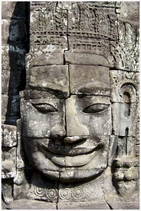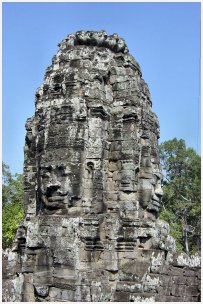 En franchissant le porche d'Angkor Thom, on pénètre dans la vaste ville royale, centre du site archéologique et apothéose de l'ère angkorienne. Au centre de la ville royale : le Bayon. Si le temple d'Angkor Wat est la majesté même, celui-ci est le mystère incarné. D'où son nom : "la montagne magique". Imaginez une forêt de têtes gigantesques, regardant dans toutes les directions... Une massive montagne, sculptée de 200 visages aux yeux inquiétants et au sourire énigmatique. Pyramide à trois niveaux, d'une hauteur totale de 43 m, le temple-montagne du Bayon est un dédale où l'on est obligé de se perdre.