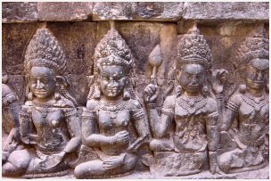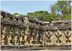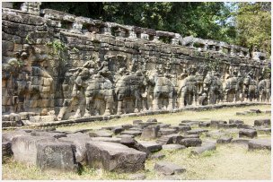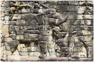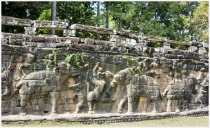 La terrasse des Éléphants : le long de la grand avenue qui part du nord du Bayon. Au début du XIIIe siècle, Jayavarman VII fit aménager cette terrasse en bordure du palais royal, sur 350 m de longueur. Il est probable qu'il pouvait assister, avec ses courtisans, aux spectacles donnés sur la grande place.